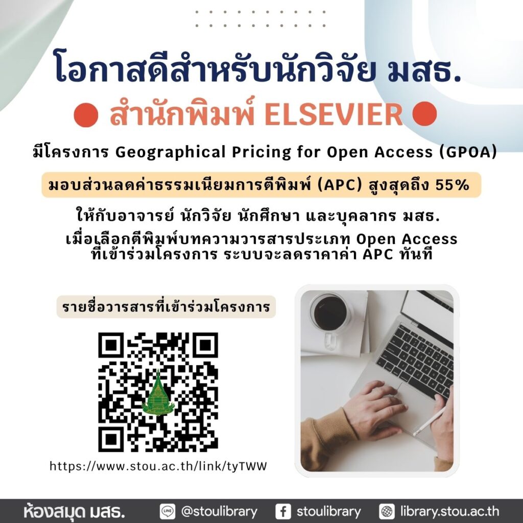 สำนักบรรณสารสนเทศ ขอเชิญอาจารย์ นักวิจัย นักศึกษา และบุคลากร มสธ. ตีพิมพ์บทความวารสารประเภท Open Access กับสำนักพิมพ์ Elsevier ตามโครงการ Geographical Pricing for Open Access (GPOA) ได้ส่วนลดค่าตีพิมพ์บทความวารสาร 55% เมื่อส่งบทความไปยังวารสารที่ร่วมโครงการ ระบบจะลดราคาให้อัตโนมัติ