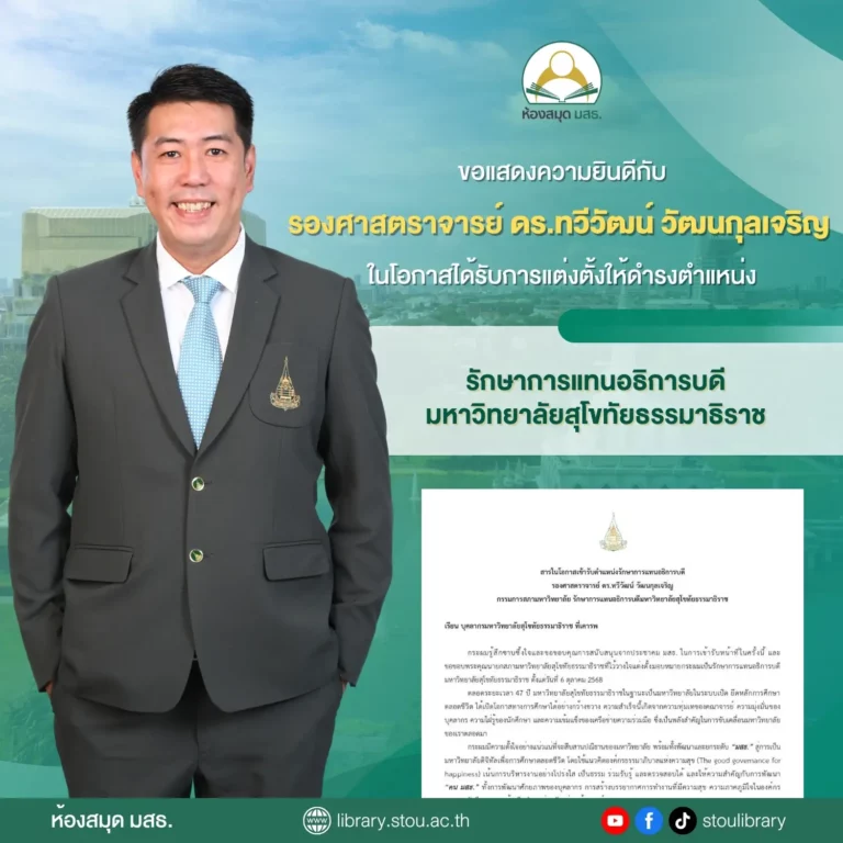 ข่าวประชาสัมพันธ์ สำนักบรรณสารสนเทศ มสธ. ขอแสดงความยินดีกับ รองศาสตราจารย์.ดร.ทวีวัฒน์ วัฒนกุลเจริญ ในโอกาสได้รับแต่งตั้งเป็นรักษาการแทนอธิการบดี มสธ.