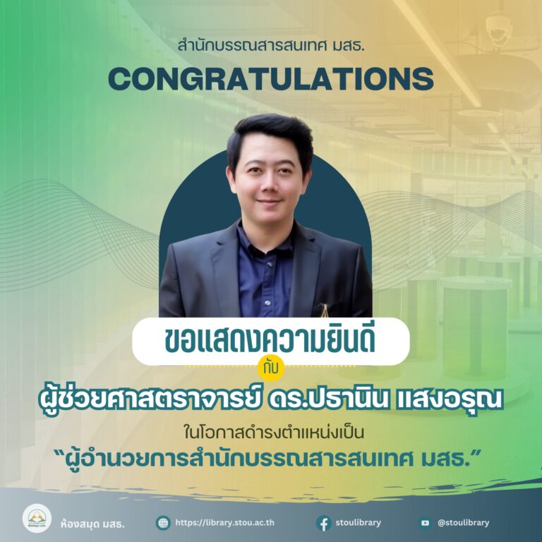 ข่าวประชาสัมพันธ์ ขอแสดงความยินดีกับ ผู้ช่วยศาสตราจารย์ ดร.ปธานิน แสงอรุณ ในโอกาสดำรงตำแหน่ง ผู้อำนวยการสำนักบรรณสารสนเทศ มสธ.