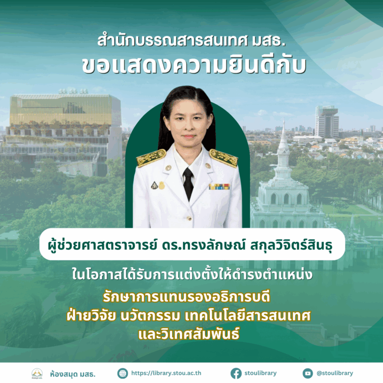 ข่าวประชาสัมพันธ์ สำนักบรรณสารสนเทศ มสธ. ขอแสดงความยินดีกับ ผู้ช่วยศาสตราจารย์ ดร.ทรงลักษณ์ สกุลวิจิตร์สินธุ ในโอกาสได้รับแต่งตั้งเป็นรักษาการแทนรองอธิการบดี ฝ่ายวิจัย นวัตกรรม เทคโนโลยีสารสนเทศ และวิเทศสัมพันธ์ มสธ.