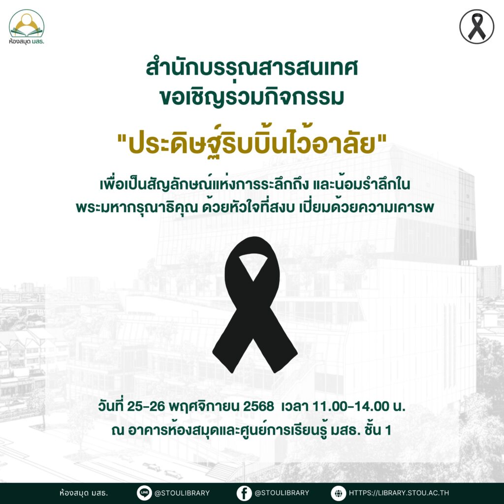 ขอเชิญนักศึกษา บุคลากร มสธ. และประชาชนทั่วไป ร่วมกิจกรรม “ประดิษฐ์ริบบิ้นไว้อาลัย” เพื่อเป็นสัญลักษณ์แห่งการระลึกถึง และน้อมรำลึกในพระมหากรุณาธิคุณ ด้วยหัวใจที่สงบ เปี่ยมด้วยความเคารพ