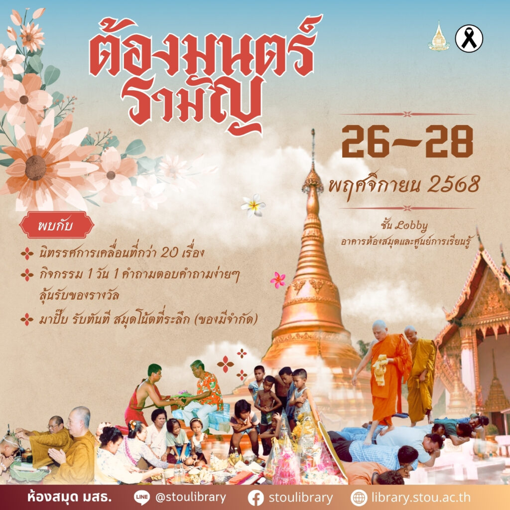 ร่วมสัมผัสกับเรื่องราวที่แสนงดงามแห่งวิถีวัฒนธรรมประเพณีของชาวไทยเชื้อสายมอญในชุมชนท้องถิ่นจังหวัดนนทบุรี และในประเทศไทย ผ่านนิทรรศการเคลื่อนที่เกี่ยวกับวิถีชีวิต ศิลปวัฒนธรรม ประเพณีมอญ ในชุมชนท้องถิ่น วันที่ 26 – 28 พฤศจิกายน 2568 ณ ชั้น Lobby อาคารห้องสมุดและศูนย์การเรียนรู้ มสธ.