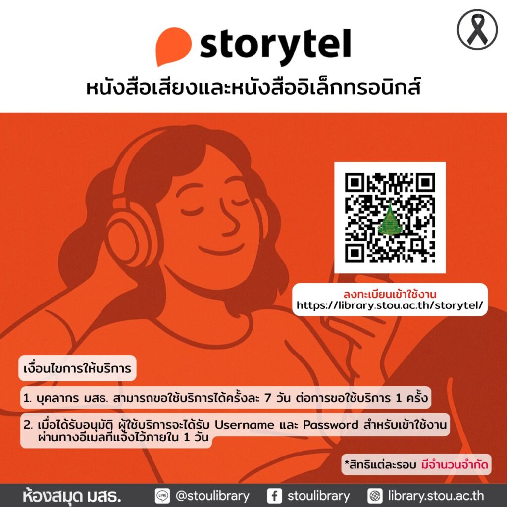 สำนักบรรณสารสนเทศ เปิดให้บริการ Storytel หนังสือเสียงและหนังสืออิเล็กทรอนิกส์ สำหรับบุคลากร มสธ. เพื่อส่งเสริมการเรียนรู้และการอ่านในรูปแบบดิจิทัล ผ่านแอปพลิเคชันที่รวบรวมหนังสือเสียงและ eBooks ภาษาไทยและภาษาอังกฤษหลากหลายประเภท ทั้งวรรณกรรม สารคดี พัฒนาตนเอง และอื่น ๆ อีกมากมาย
